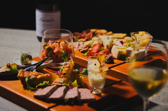 キッシュやパテドカンパーニュ、「白ブドウとフレッシュチーズの白和え」などのフレンチ前菜が揃い、ワインを片手に会話が弾む、気軽なムードが魅力です。ディナーには生ハムやドライフルーツなどのスナックも充実しています。