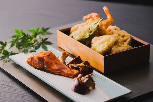 「サーモンの柚子胡椒焼き」や、西京味噌を使用した和風のグラタンなど、ごはんが進む品々が揃います。サクサクと軽い食感の天ぷらは、天丼や天ぷら茶漬けでも楽しめます。