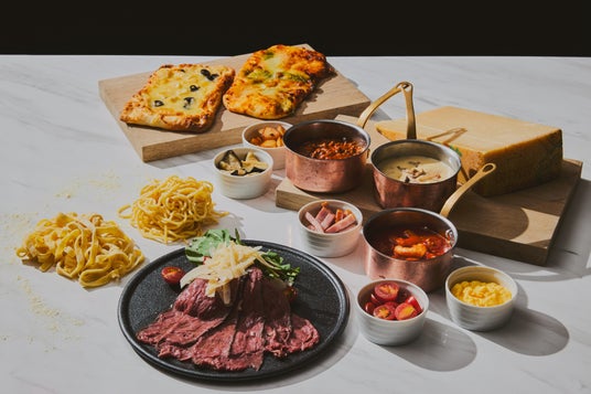ワインが進む「国産牛ローストビーフのタリアータ(ディナー限定)」や2種類のピザのほか、ボロネーゼなどのお好みのソースを、スパゲッティやフェットチーネと組み合わせて作るカスタムパスタにもご注目ください。