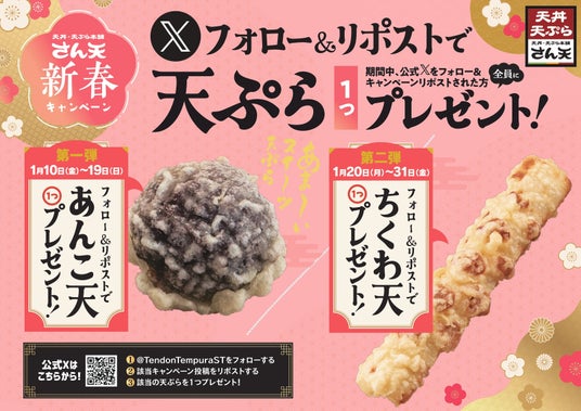 サトフードサービス株式会社(本社・大阪府大阪市、代表取締役社長・杉本 貴之)が運営する「天丼・天ぷら本舗 さん天 」では、2025年1月10日(金)~1月31日(金)まで、公式Xでトッピングお試しキャンペーンを実施いたします。公式Xアカウントをフォローし、キャンペーン投稿をリポストすることで、第一弾の1月10日(金)~1月19日(日)まではあま~いスイーツ天ぷらの「あんこ天」を、第二弾の1月20日(月)~1月31日(金)までは豪快で食べ応えのある「ちくわ天」がその場でもらえるキャンペーンを期間限定で開催します。簡単に応募でき、期間中に何度でも揚げたてサクサクの天ぷらがもらえる大変お得なキャンペーンですので、ぜひご利用ください。