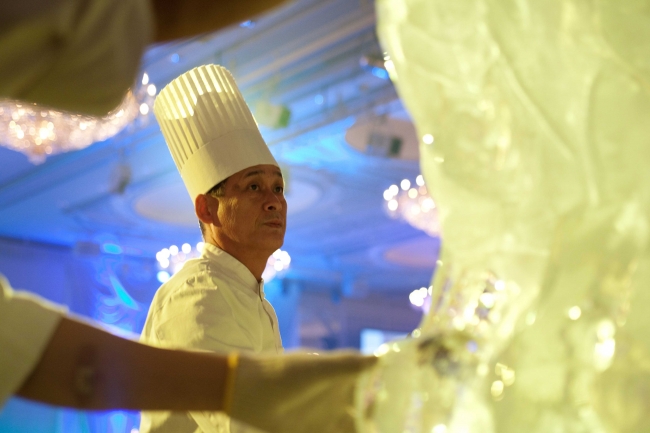 1階 ホテルロビーにて氷彫刻のパフォーマンスを行います。