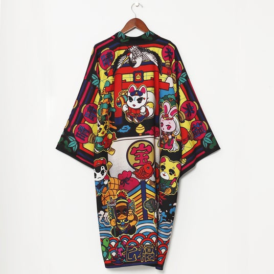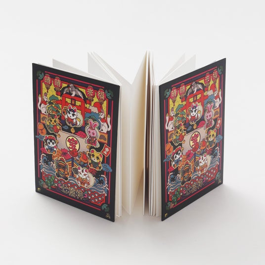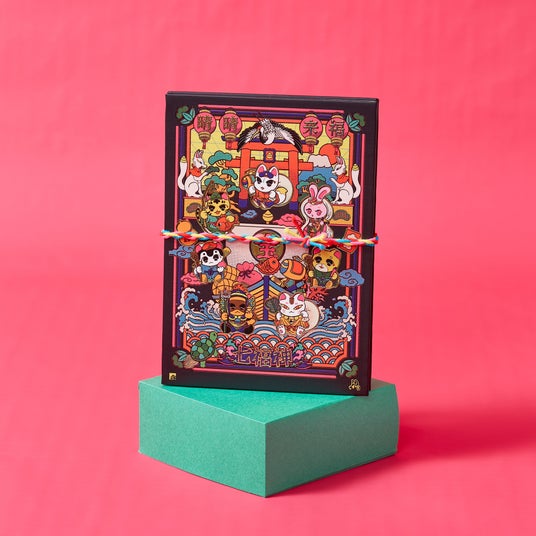七福神や宝船、富士山や鶴亀など華やかでおめでたいモチーフが描かれています。伝統的な和の要素とポップで楽しげな要素を併せ持つデザインとなっています。