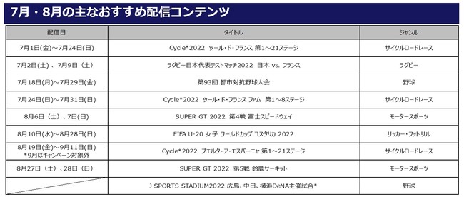 今年の夏の総合パック 1か月お試しキャンペーン期間には「Cycle*2022 ツール・ド・フランス」、「ラグビー日本代表テストマッチ2022 日本 vs. フランス」、「SUPER GT 2022」、「都市対抗野球大会」など、各ジャンルのJ SPORTSのおすすめコンテンツが盛りだくさん。この機会にこれまで観戦経験の少ないスポーツジャンルをご覧になってみてはいかがでしょうか?