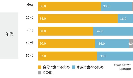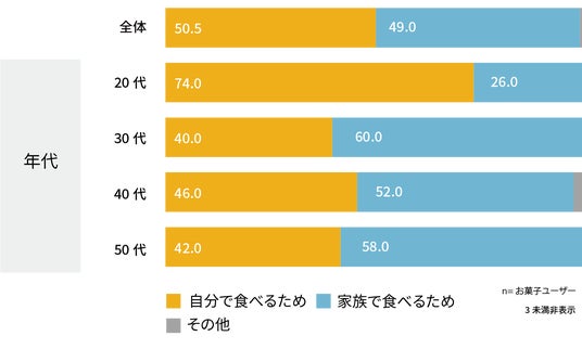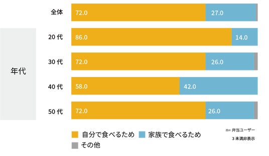 コンビニにおいては、どの年代でも「自分で食べるため」の方が多くなる。