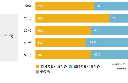 - 弁当は、スーパーに比べ、コンビニの方が「自分で食べるため」の傾向が顕著であり、特に30代・50代において突出している