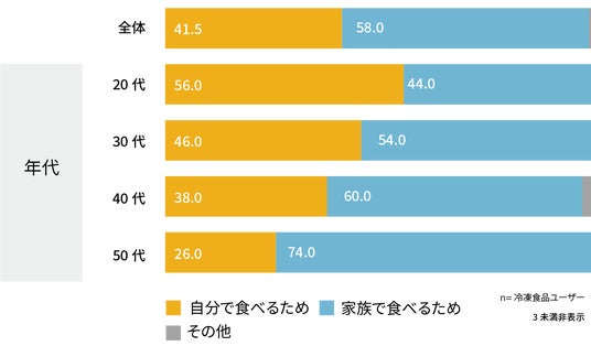 スーパーで購入する際は、「家族で食べるため」が多くなる。年代が上がるにつれ、その傾向が強くなる。
