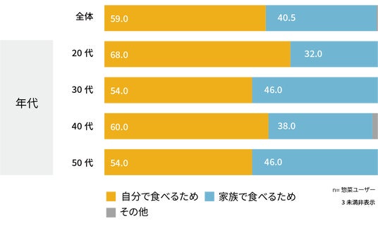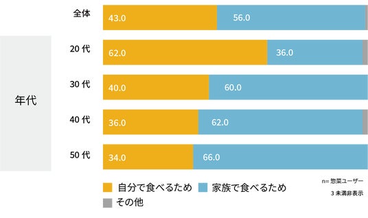 - 惣菜において、30代以上は、スーパーでは家族用、コンビニでは自分用と用途を使い分けている