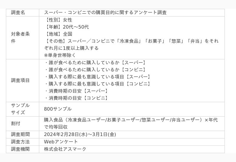 マーケティングリサーチ会社の株式会社アスマーク(東京都渋谷区東、代表取締役:町田正一)は、全国20~50代女性に「スーパー・コンビニでの購買目的に関するアンケート調査」を実施し、その結果を3月12日に公開しました。