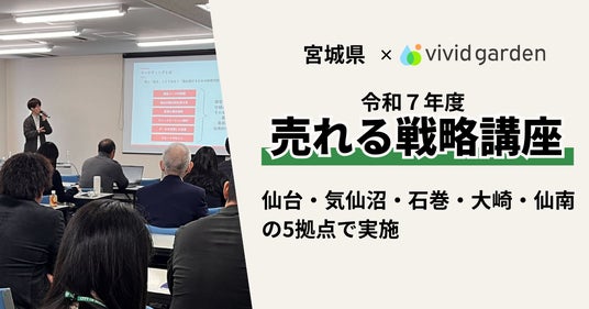 認知度・利用率など9つのNo.1(※1)を持つ日本最大の産直通販サイト(※2)「食べチョク」を運営する株式会社ビビッドガーデン(本社:東京都港区、代表取締役社長:秋元里奈)は、宮城県より「令和7年度売れる戦略講座開催業務」を受託し、「令和7年度 売れる戦略講座」を2025年8月から2026年1月にかけて、宮城県内5地域(仙台・気仙沼・石巻・大崎・仙南)にて全5回開催しました。