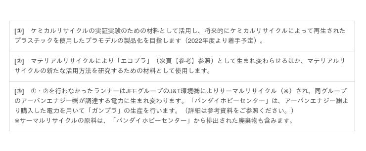 集まったランナーは、「ガンプラ」の生産工場「バンダイホビーセンター」(静岡県静岡市)から生産工程で排出されるプラスチックと合わせて、一部をケミカルリサイクルの実現に向けた実証実験用の材料として、残りをマテリアルリサイクルとサーマルリサイクルにより再活用します。