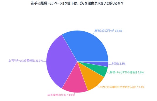これは、「若手の離職・モチベーション低下の理由」として「上司やチームとの関係性」(33.3%)が「業務とのミスマッチ」(33.3%)と並んでトップであることと深く関連していると考えられます。