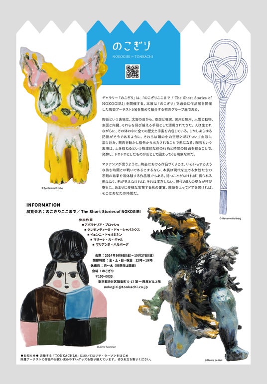 株式会社トンカチ(東京都渋谷区、代表:勝木悠香理)は代官山のギャラリーのこぎりにて、陶芸アーチスト5名のグループ展「のこぎりここまで / The Short Stories of NOKOGIRI」を開催中。期間は2024年10月27日(日)まで。