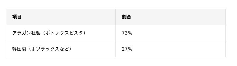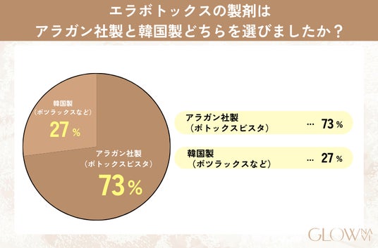 エラボトックスに使用された製剤は、「アラガン社製(ボトックスビスタ)」が全体の73%と多数を占め、「韓国製(ボツラックスなど)」は27%にとどまりました。