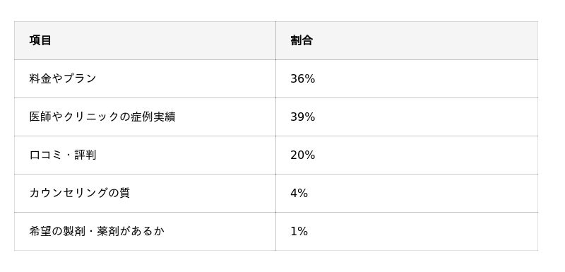 クリニックを選ぶ際の決め手は、「医師やクリニックの症例実績」(39%)、「料金やプラン」(36%)、「口コミ・評判」(20%)と分散しました。