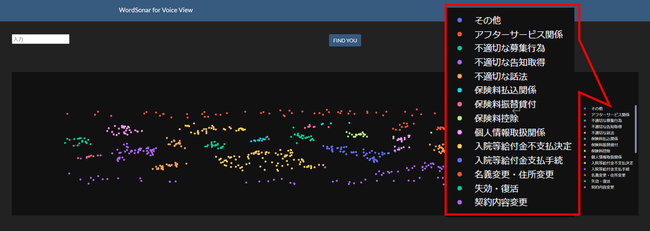 WordSonar for VoiceViewを用いると、生命保険会社に寄せられた“お客さまの声”をこの37の項目ごとにマップ上に分類し(図1)、どの項目が多いか、また項目同士の位置が近く、似た性質を持つため、同時に起こりやすいか等を確認することができます。例えば「保険料払込関係」と「解約手続」という項目は、人の感覚で分類すると性質が異なると考えがちですが、AIによって「保険料が戻ってこない」「保険料を返さない」といった「返金」に関する苦情という類似性を把握し、近い位置にマッピングされます。また類似性を示す具体的な問い合わせの文言を示すことができます(図2)。