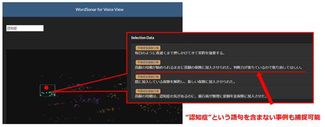 さらに、トラブルや不祥事の原因となる事象を事前に把握する方法として、「支払い拒否」「保険金の不払い」「認知症」といったキーワードを入力することで、関連性の高い“お客さまの声”を浮かび上がらせることができます(図3)。例えば、「認知症」と入力すると、「高齢の母親が勧められるままに高額の保険に加入させられた。判断力が落ちているので取り消してほしい」「既に加入している保険を解約し、新しい保険に加入させられた」等といった「認知症」という表現を使っていなくてもAIが関連性ありと判断した“お客さまの声”が一覧で表示されます。このようにサンプル抽出では見逃されたり、キーワード検索では検出されなかったりする「不適切な募集行為」と疑われるやりとりをいち早く把握し、対応を現場に指示することで、トラブルや不祥事を最小限に抑えることが可能となります。