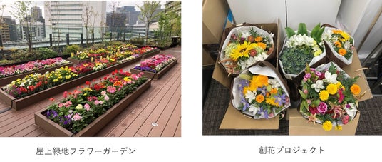 また生物多様性の保全を目的とし、オフィスワーカーや地域住民との共同でモニタリング調査や生き物住処づくりイベントを実施しており、特に都市緑化における指標とされるシジュウカラの巣箱設置や昆虫の住処づくりを通じ、環境教育の場としても積極的に機会の提供をしています。これらの活動のほか、屋上緑地でのフラワーガーデンツアーや「創花プロジェクト」を実施しています。創花プロジェクトは、オフィスワーカーに見て・触れて・楽しんでもらうことを目的とし、屋上緑地に設置した花壇で、春・夏・秋と季節ごとの花を植え、また育てた花を活用しエントランスホールのディスプレイやオフィスワーカーへの花束贈呈、ワークショップなどを実施しています。
