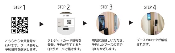 予約時に受け取るQRコードを読み取り入室が可能。退室は、ドアを閉めるだけで完了です。