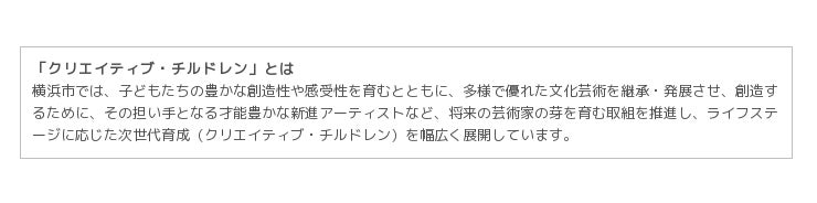 横浜市が文化芸術創造都市の一層の推進を図るべく展開しているクリエイティブ・チルドレンに基づき、横浜から世界に文化芸術を発信する次世代のアーティストを発掘し、そのキャリアアップを支援するための助成です。