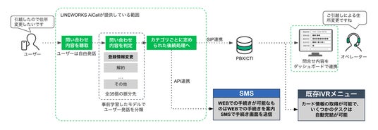 クレディセゾンではAIによる顧客対応の仕組みを「AIナビ」と名付けています。まずは、事前学習した「LINE WORKS AiCall」が、顧客との対話から問い合わせ内容を判定してカテゴライズ。用件に応じて、WEBでの手続きが最適な問い合わせはSMSでWEBへ誘導、そのまま既存IVRメニューで処理が完結するものはIVRへ転送、人による対応が必要なものはオペレーターへ転送するなど、問い合わせ内容に応じて的確な対応がなされるフローを構築しました。