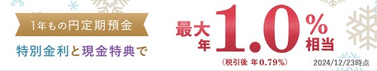 これにより、2024年12月4日(水)から実施中の冬のボーナスキャンペーンにおいて、2024年12月23日(月)以降にお預け入れの場合、1年もの円定期預金金利が最大年1.0%(税引後 年0.79%)相当で、ネット銀行最高金利水準(注1)となります。