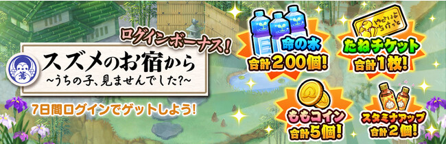 「スズメのお宿から」の開催に合わせて、豪華報酬が手に入るログインボーナスを開催いたします。
