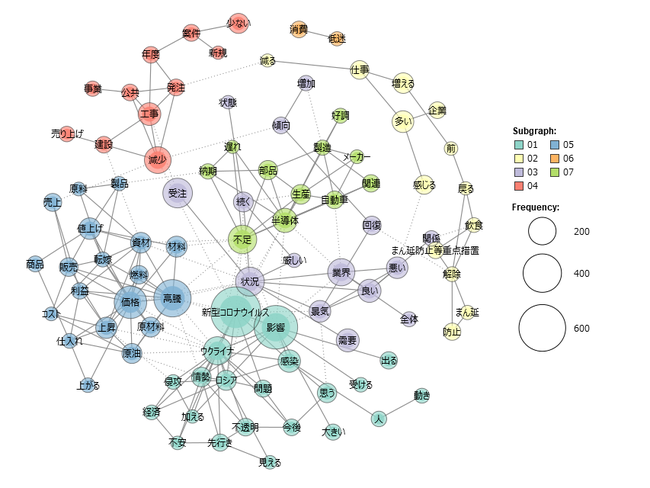 ※右の共起ネットワーク図は、テキストデータの中で頻出度合いが高い単語(円の大きさが、その単語の頻出度合いを表す)を抽出し、その単語間での関係の強さ(同じ文脈で使われているか)を線で表している。