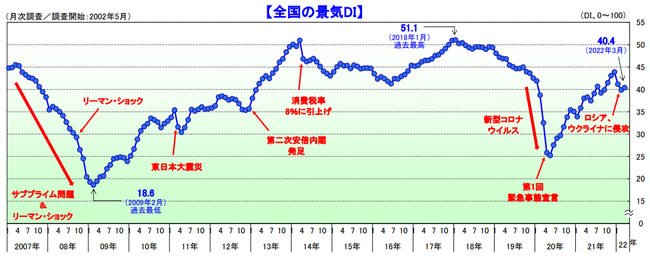 2022年3月の景気DIは前月比0.5ポイント増の40.4となり、3カ月ぶりに改善した。