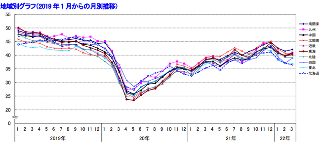 『九州』(40.9)…前月比1.4ポイント増。「人が動き出し経済が回り出した」(広告制作)といった声が聞かれるなど、「佐賀」を除く域内7県が上向き、3カ月ぶりに改善した。県別では「熊本」「大分」が大きく改善し、「大分」は都道府県別で第1位となった。