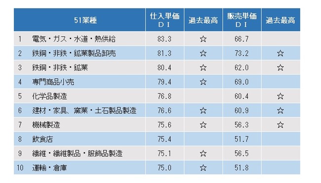 『卸売』『サービス』など7業界が改善、『製造』『運輸・倉庫』など3業界が悪化した。ウクライナ情勢、新型コロナウイルスの影響で原材料価格の高騰がより深刻となるなか、仕入単価DIは10業界中8業界、販売単価DIも5業界で過去最高の水準まで上昇した。
