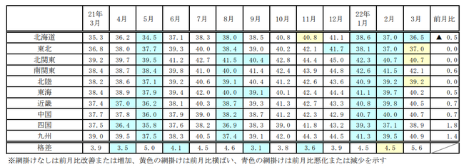 『九州』など10地域中6地域が改善、『北海道』が悪化、『東北』『北陸』など3地域が横ばいだった。まん延防止等重点措置が21日にすべての地域で解除されたことはプラス要因。一方、福島県沖地震は観光シーズンを前に地域経済の回復に水を差す格好となった。