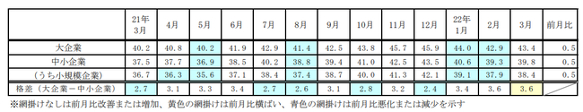 「中小企業」(39.8)…同0.5ポイント増。3カ月ぶりに改善したものの、2カ月連続で40を下回った。値上げ前の駆け込み需要や旺盛な自宅内消費が続く「飲食料品小売」など、『小売』は全9業種が改善。他方で『運輸・倉庫』は燃料高を受け3カ月連続で悪化した。