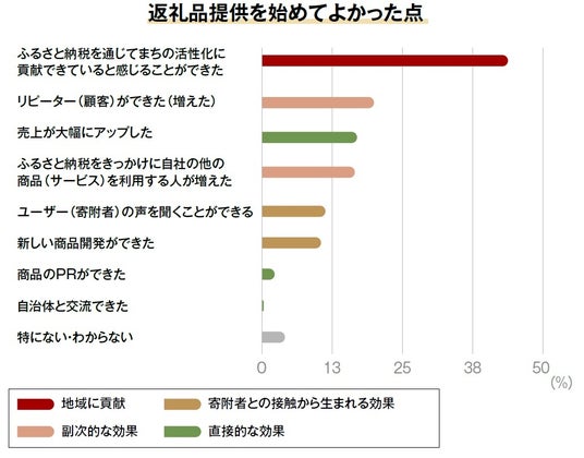 ふるさと納税参入の最大のメリットは「まちの活性化に貢献できた」こと。通常の事業拡大との違う効果にメリットを感じている人が約40%。
