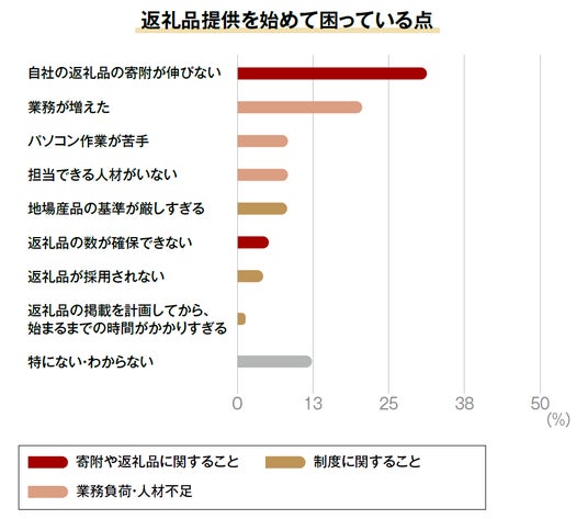 次に多かったのが「リピーター(顧客)ができた」(20%)と「ふるさと納税をきっかけに自社の他の商品(サービス)を利用する人が増えた」(17%)で、ふるさと納税に参入したことで寄附以外の副次的な効果が生まれたことがメリットと感じているようです。