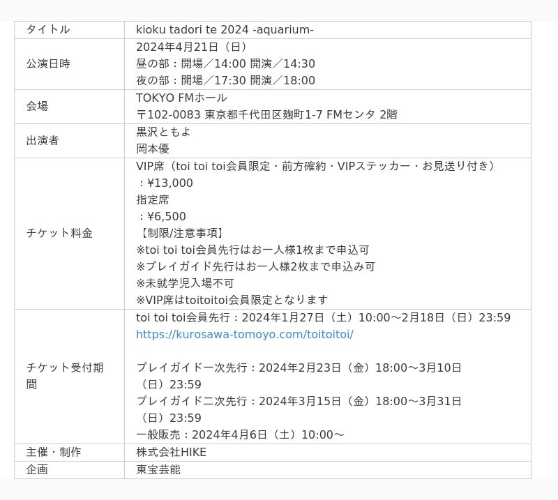 女優や声優として活動する黒沢ともよの「kioku tadori te 2024 -aquarium- 」(主催・制作:株式会社HIKE)を2024年4月21日(日)に開催致します。今回は振付家であり、ダンス集団「TABATHA」主宰の岡本優さんをゲストに迎えます。本イベントは2022年から開催し、黒沢ともよのこれまでを振り返ってきましたが、今回は昨年までとは少し違う「kioku tadori te -aquarium- 」をお届け致します。チケット販売は、1月27日(土)10時より自身がディレクションするクリエイティブスペース「toi toi toi」にて会員先行受付を開始致します。