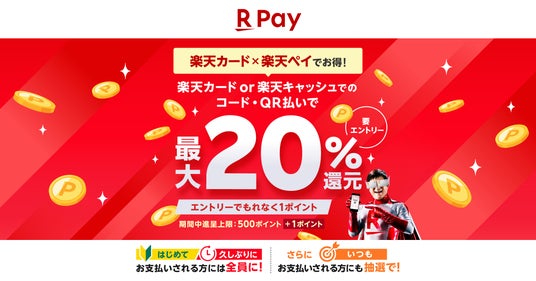 「楽天カードもしくは楽天キャッシュでのコード・QR払いで最大20%還元!」キャンペーンは、キャンペーン期間中にエントリーのうえ、「楽天ペイ」アプリで、「楽天カード」または「楽天キャッシュ」を支払い元に設定のうえ、コード払い(注4)で支払うと、最大20%の「楽天ポイント」が還元されます。「楽天ペイ」アプリではじめて、または久しぶりに支払いをする方(注5)には全員に、いつも利用をしている方(注6)には抽選で1,000名に、最大20%の「楽天ポイント」を還元します。さらに、エントリーした方全員に「楽天ポイント」を1ポイント進呈します(注7)。