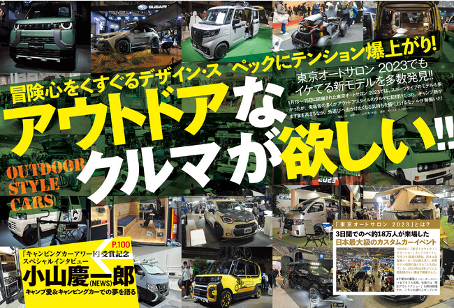 1月に開催された「東京オートサロン 2023」で、アウトドアスタイルの魅力的なクルマを多数目撃!! 冒険心をくすぐるデザイン・スペックのクルマたちを多数掲載します。また「キャンピングカーアワード」を受賞した、NEWS 小山慶一郎さんのスペシャルインタビューも収録。キャンプ愛をアツく語ってもらいました。