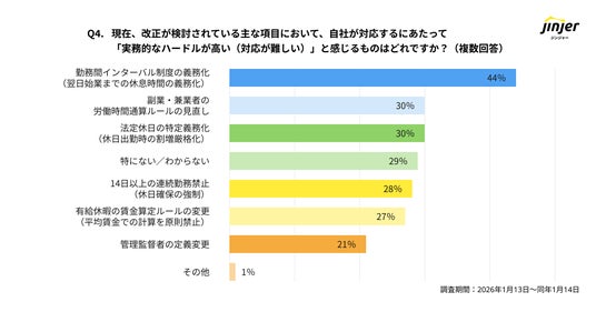 改正検討項目のうち、自社での対応ハードルが最も高いと感じるものは「勤務間インターバル制度の義務化(44%)」でした。次いで「副業・兼業者の労働時間通算(30%)」や「法定休日の特定義務化(30%)」が続いています。