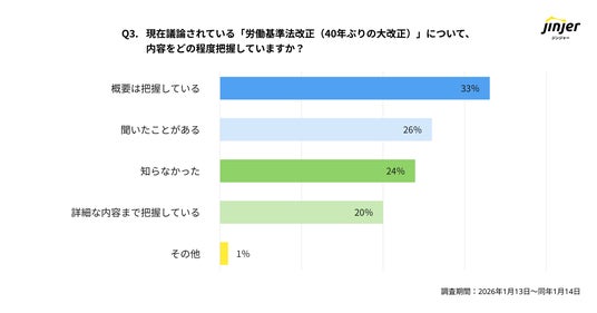 現在議論されている労基法改正の内容について、50%が「聞いたことがある」「知らなかった」と回答。詳細な内容まで把握しているのは20%にとどまる