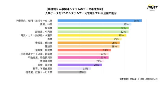 また、業種別に人事関連システムのデータ連携方法について調査したところ、人事データを一元管理できていると答えた企業の割合は「学術研究・専門・技術サービス業(38%)」「農業・林業(33%)」「製造業(32%)」の業種では上位である一方で、「医療・福祉業(20%)」「教育・学習支援業(15%)」「宿泊業・飲食サービス業(13%)」は低く、業種ごとのばらつきが大きいことが明らかになりました。