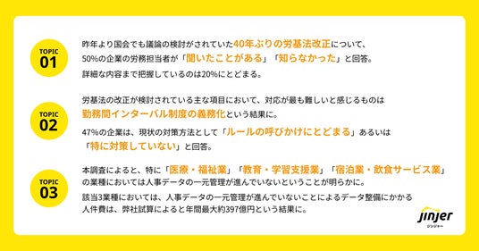 統合型人事システム「ジンジャー」を提供しているjinjer株式会社(本社:東京都新宿区 代表取締役社長CEO:冨永 健 以下、jinjer)は、企業の労務担当者 計900名を対象に「“40年ぶりの労基法改正”に関する実態調査」を実施しました。