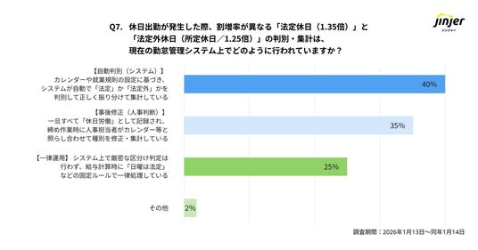 休日出勤時の割増率判定において、システムで自動判別できている企業は40%にとどまりました。一方で、35%の企業は依然として「人事担当者による目視と事後修正」を行っているという結果になりました。