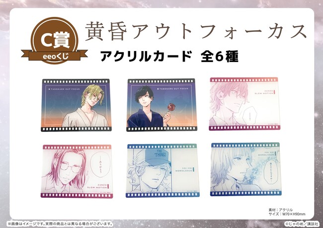 今回のeeoくじには『黄昏アウトフォーカス』と、『残像スローモーション』『宵々モノローグ』が登場。新作グッズを「eeoくじ」でGETし、じゃのめ先生が描く尊いアオハルの世界にどっぷり浸かってみてはいかがでしょうか?