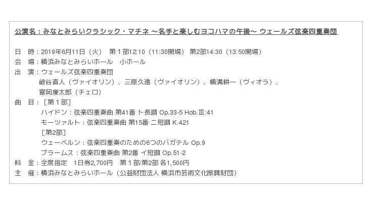作品と真摯に向き合い丁寧な音楽づくりを大切にする≪ウェールズ弦楽四重奏団≫。2008年ミュンヘン国際音楽コンクール第3位入賞を果たし、ヨーロッパで活動の場を広げてきた。日本に拠点を移してからも、新進気鋭のカルテットとして活躍が目覚ましい。カルテット名は「真実」「本物」を意味するラテン語の“Verus(ウェールズ)”と名付けられ、緻密に作り上げる“響き”は彼らの特徴であり、魅力である。