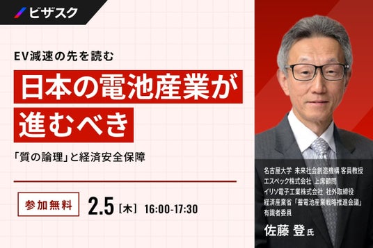 「知見と、挑戦をつなぐ」をミッションにグローバルなナレッジプラットフォームを運営する株式会社ビザスク(以下、当社)は、『日本の電池産業が進むべき「質の論理」と経済安全保障』をテーマに、名古屋大学 未来社会創造機構 客員教授、エスペック株式会社 上席顧問、イリソ電子工業株式会社 社外取締役、経済産業省「蓄電池産業戦略推進会議」有識者委員でもある 佐藤 登氏 ご登壇による無料オンラインセミナーを 2/5 (木) 16:00 より開催します。