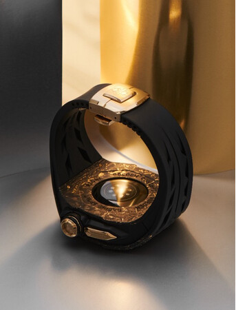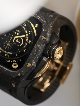 今回、初入荷を果たした「RSC49 GOLD CARBON」は、2022年に発売されたアップルウォッチのプロフェッショナルモデル「ウルトラ」に対応したハイグレードモデル。「ウルトラ」専用に設計された無骨な形状とPLYカーボンファイバーの組み合わせでよりタフでよりラグジュアリーに進化した最新コレクションです。