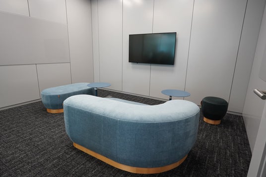 来客エリアは”発信の場”としての機能を重視し、壁一面の大型ディスプレイや各会議室のモニターが引き立つよう、黒を基調とした内装デザインになっています。待合スペースは、クイックなミーティングやセミナー時の休憩スペースとしても使用できます。