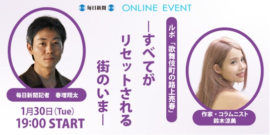 毎日新聞社(代表取締役社長執行役員:松木健)は1月30日(火)午後7時からオンラインイベント「ルポ『歌舞伎町の路上売春』ーすべてがリセットされる街のいまー」を開催します。日本最大の歓楽街、新宿・歌舞伎町。この街で若い女性の路上売春が急増している現状について、当事者の声を聞き続ける春増翔太・毎日新聞記者が作家・鈴木涼美さんと語ります。
