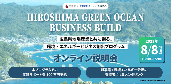日本最大級のオープンイノベーションプラットフォーム「AUBA(アウバ)」を運営する株式会社eiicon(エイコン 本社所在地:東京都港区虎ノ門、代表取締役社長:中村 亜由子、以下「eiicon」)は、2023年8月1日(火)、広島県地場産業と共に創る、環境・エネルギービジネス創出プログラム『HIROSHIMA GREEN OCEAN BUSINESS BUILD(以下 本プログラム)』の開催並びに、本プログラムに参画する広島県内企業5社と各社の募集テーマを発表し、パートナー企業の応募受付を開始しました。