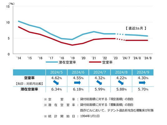 空室率は前月比プラス0.08ポイントの4.30%となり、6ヵ月ぶりで小幅に上昇した。新築ビルに移転したテナントによる複数の二次空室が現空となった一方、拡張やビルグレード改善目的の移転により空室消化が進んでいる。潜在空室率は前月比マイナス0.18ポイントの5.70%となり、7ヵ月連続の低下となった。
